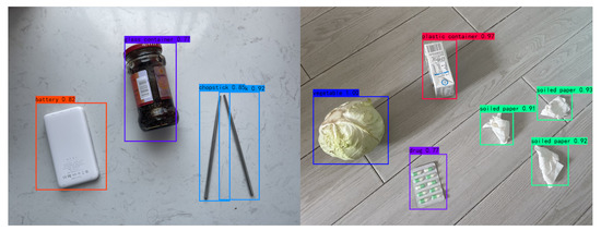 We took a set of images (of common household garbage) to test YOLOG and passed these images to the deployed YOLOG model. We boxed out the detected objects and marked the classes and confidences on the top left of the box. The results are shown in Figure 11. It can be seen that the model has a strong ability to generalize and can accurately identify garbage.