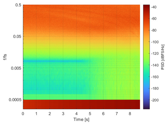 Spectrogram of the M output; the signal is divided into 8192 segments of ms to compute the spectrogram. Input signal is a ramp that starts at V and ends at V. Modulator parameters are: third-order, 4-bits, kHz, , .