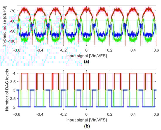 (a) IBN power and (b) number of used DAC levels. M common parameters are: third-order, 4-bits, , kHz. values are 1.5 (blue), 1.8 (green), and 2.5 (red). Input signal is a slow ramp whose slope is mV/s. Output signal is divided in segments of ms. and are included.