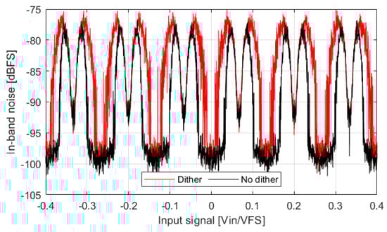 The effect of dither on IBN power bumps is also analyzed to find out whether it can help to reduce them. Dither injects a pseudorandom sequence at the quantizer input that helps to decorrelate the quantization error and the input signal; it has been widely used to attenuate idle tones [12,13,14]. Dither has been implemented with a thirteenth-order Linear Feedback Shift Register (LFSR). The signal activity at the quantizer input is increased and the probability of using more than two levels is increased. Figure 6 shows the effect of dither on IBN power. It is clear that NP regions are wider and noise power is slightly higher. Dither does not decrease IBN power in or outside of NP regions. Both lowpass and highpass dither create the same effect as unfiltered dither. We tried to achieve constant IBN power by forcing the M to use three DAC levels for all the input signals; this is not possible (even if the dither amplitude is manually optimized), and noise bumps are always present. The results lead to the conclusion that dither is not appropriate to reduce the observed IBN bumps.