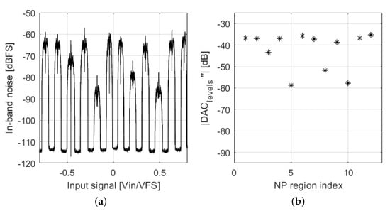 Quantization error in Ms is usually assumed to be an additive white noise sequence, independent of the quantizer input and uniformly distributed between and [17]. If the real behavior of a M is analyzed, it can be seen that the quantization error sequence depends on the modulator input signal, it is not white, and it is not uniformly distributed. The statistical and spectral properties of the quantization noise sequence vary depending on the input signal level. If the input signal is at low frequencies, it will cross NP regions, and regions in which only two different levels are used. A comparison of quantization error, in and outside of NP regions, can be observed in Figure 18. The histograms (a) and (b) clearly show that the quantization error PDF depends on the input signal level, being extremely different in NP regions and outside of NP regions. The histograms do not have a uniform distribution for any of the simulated cases. Figure 18c,d show the PSD comparison in and outside of NP regions. IBN power is dBFS in NP regions, and dBFS outside of NP regions. Quantization IBN power is increased by dB in NP regions.