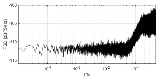 Note that each k NP region will have a different IBN power because the involved DAC cells have different errors. Assuming a constant mismatch for a defined CMOS technology node, the relative error of the DAC cells when compared with the full-scale range of the M is reduced if is increased. On the other hand, NTF and OSR also impact IBN power in NP regions. Aggressive NTFs introduce more noise power and create wider NP regions than conservative NTFs due to the increased probability of using three different DAC levels, as shown in Figure 5. The PSD of the DAC error sequence () is flat for low and medium frequencies; this can be observed in Figure 9. If OSR is increased, then a bigger part of falls out of the ADC bandwidth, reducing IBN power. Modulator order is not considered because the NTF effect is properly characterized by its and .
