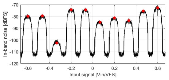 The quantization error shown in Figure 18c,d appears at the M output filtered by the NTF, as shown in Figure 18e,f. The filtering operation reduces IBN power from dBFS to dBFS in NP regions and from dBFS to dBFS outside of NP regions. As in the previous case, IBN power at the M output is increased by dB in NP regions. This leads to increased IBN power at the output of the M when the input signal is in an NP region, as can be seen in Figure 19. IBN power is equal for all the NP regions.