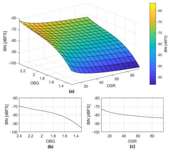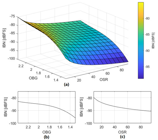 The OBG determines the probability of generating a value close to at the loop filter input; IBN power in NP regions is increased if high OBG values are used. If OSR is increased, a bigger part of falls out of the bandwidth, reducing IBN power because the PSD of is flat for low and medium frequencies (shown in Figure 16). When the number of bits of the quantizer is increased, is decreased and consequently and IBN power are reduced too.