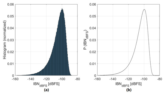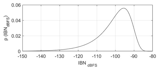 A third-order, 4-bits, MHz, kHz, , M-ADC with high resolution for audio applications generated with the Schreier toolbox is used as an example to show the effect of IBN power increase due to DAC mismatch. The PDF of IBN power in NP regions in assuming is shown in Figure 13, where (21) has been plotted. Quantization noise is designed to be dBFS; for a power efficient design, thermal noise should be 12 dB higher ( dBFS) [1]. power is mainly distributed between dBFS and dBFS, meaning that the noise power increase can potentially be 22 dB higher than thermal noise. The probability of a certain NP region being above the thermal noise level is ; the probability of being 12 dB higher than the thermal noise level is , showing that IBN power increase is very likely to degrade the ADC performance. The probability of having at least one NP region with a noise power increase 12 dB higher than the thermal noise is higher than , meaning that almost all manufactured circuits will be affected by the noise power increase.