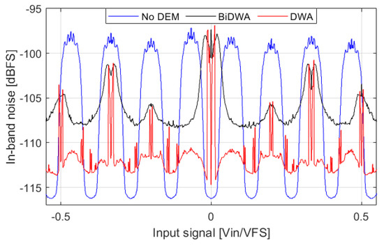 IBN power comparison for the following cases: no DEM, DWA, and Bi−DWA. In total, 300 simulations have been averaged. Input signal is a slow ramp. Output signal is divided in segments of ms. M parameters are: fourth-order, 4-bits, MHz, kHz, , , = 0.2%.