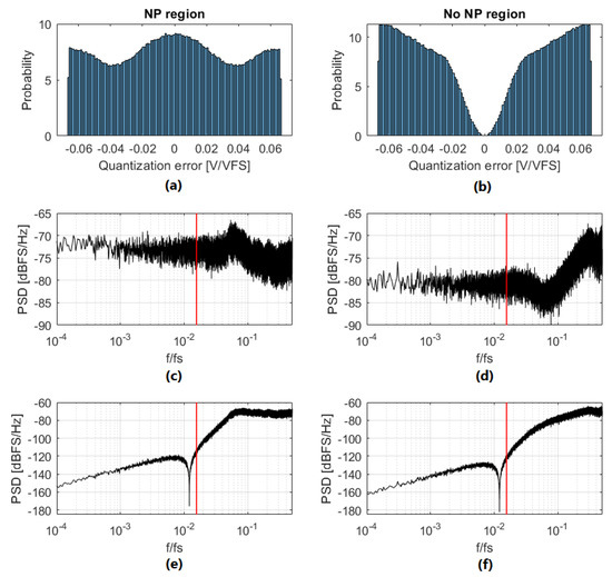 Quantization error comparison (in and outside of NP regions). M parameters are: third-order, 4-bits, , . Histogram of quantization error in NP regions (a) and outside of NP regions (b). PSD of quantization error in NP regions (c) and outside of NP regions (d); vertical red line marks the modulator bandwidth. PSD of quantization error at the M output in NP regions (e) and outside of NP regions (f); vertical red line marks the modulator bandwidth.