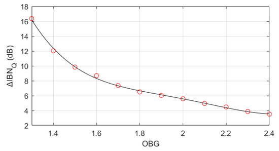 The proposed estimation method is based on the observations extracted from extensive simulations. Equations (23) and (24) are used to estimate IBN power in in NP regions due to loop filter linearity error. Equation (24) is valid for OBG values in the range of to . The influence of OBG on IBN power has been obtained from multiple simulations. The results extracted from these simulations have been fitted to the polynomial expression shown in (24). Figure 17 shows the value of (23) for for different OSR and OBG values.