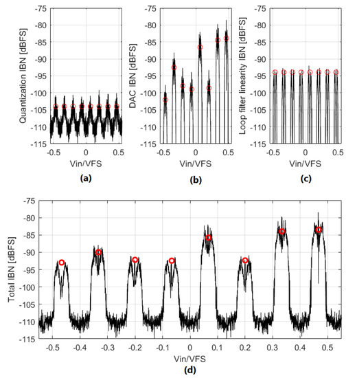 Comparison of the contributions of the different IBN sources analyzed in this article. The black lines represent the simulated IBN power; the red circles mark the estimated IBN power in NP regions. Input signal is a very slow ramp. M parameters are: third-order, 4-bits, , , . Output signal is divided in segments of ms. (a) Quantization IBN power. (b) DAC mismatch IBN power. (c) Loop filter linearity error IBN power. (d) Total IBN power.