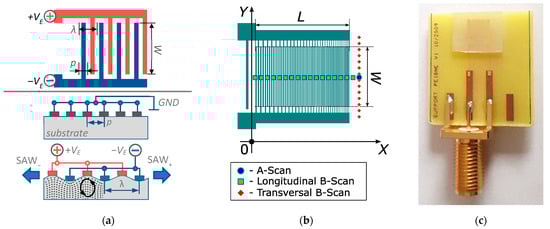 - Fall, D.; Duquennoy, M.; Ouaftouh, M.; Smagin, N.; Piwakowski, B.; Jenot, F. Optimization of Interdigital Transducers for the Generation of Surface Acoustic Waves over a Large Bandwidth (20–125 MHz). Sens. Actuators A Phys. 2018, 273, 303–310. [Google Scholar] [CrossRef]