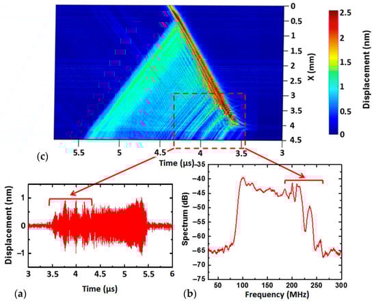To identify the reasons behind the ripples observed in the time signal envelope, an optical B-Scan in the longitudinal direction of the transducer was performed. The scan line is located in the middle of the transducer and slightly exceeds the limits of the electrode overlap area. It is represented by green squares in Figure 1b. The scan result is shown in Figure 3c. This space–time diagram displays the bidirectional emissions of the elementary interdigital transducer electrode pairs. In correspondence with the excitation chirp signal, the emission starts at the maximum frequency of 240 MHz at a time instant of 3.5 µs. The other electrode pairs are subsequently activated, progressing linearly from high to low frequencies. The emission disappears at approximately 4.5 µs.