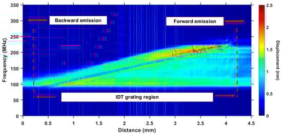 The spatial spectrogram presented in Figure 4 offers greater insight into the directivity of the dispersive IDT emission. It represents the results of the FFT for the B-scan data in Figure 3c. For example, in [,], directional emission was simulated using P-matrix formalism for a series of chirped transducers deposed on LiNbO3 and possessing 200 nm-thick aluminum electrodes. The difference in the acoustic power, emanating in opposite directions, was demonstrated. However, all the frequency components were present in the forward- and backward-emitted SAW. At the same time, our experimental results show that the reflectivity of a gold electrode grating causes all the high-frequency components to be completely redirected in the direction of forward emission (Figure 4). Only a narrow band signal in the vicinity of 100 MHz is able to propagate in the backward direction. The spectrum energy ratio between the forward and backward emissions is about 7.8 dB.