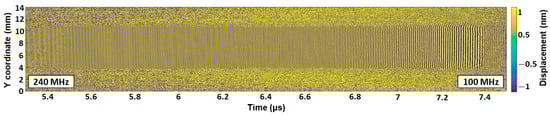 Additionally, the complete spatial–temporal distribution of the wave packet was optically measured by performing a B-scan in the direction perpendicular to the acoustic propagation (Figure 5). The scan line was located in the vicinity of the IDT aperture (shown by the red diamonds in Figure 1b). The colormap corresponds to the displacement in nanometres. The laser Doppler vibrometry shows a stable emission over the whole aperture width and for all the emitted frequencies.
