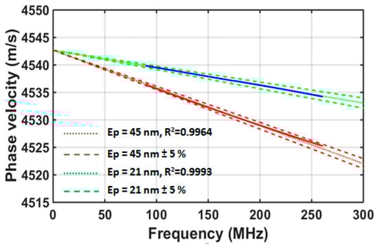 The estimation of the thickness of the layers Ep using the experimental measurements of the velocity dispersion consisted in solving the inverse problem. The dispersion curves depend, in particular, on the thickness of the layers, as well as the Young’s modulus E and Poisson’s ratio ν of the layers and the substrate. For each coated wafer, an inversion method was used to identify the best of the layer thickness fit (the elastic coefficients of the layer and substrate are known). This enables dispersion curves of the theoretical and experimental velocities that are as close as possible to be obtained. First, the theoretical calculation was carried out using rounded values for the thicknesses. These theoretical phase velocity dispersion curves were calculated within the 100–240 MHz band. Then, a least squares minimization routine was performed to adjust the set of parameters, so that the theoretical velocities were as close as possible to the measured velocities. Thus, the inversion algorithm is based on the dichotomy principle and the minimization of the Pearson coefficient R2. The objective function R2 must be as close to 1 as possible.