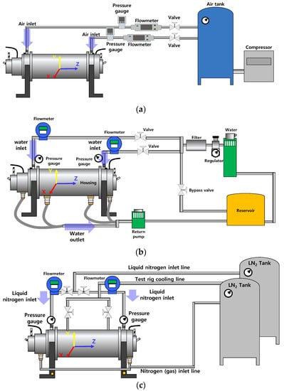 Figure 3a–c depict schematic views of the test fluid supply systems (air for Figure 3a, water for Figure 3b, and liquid nitrogen for Figure 3c) into the test bearings. The test fluid for bearing lubrication enters into each test bearing through steel pipes installed at the housing. The pressure gauges and the flowmeters measure and record the pressure and flow rate of the test fluids fed into the test bearings. For air-lubricated bearing tests (Figure 3a), the air flow meters measure the flow rate up to 200 L/min with ±1.5% of full-scale accuracy. The air pressure gauges measure the pressure up to 10 bar(g) with ±2% of full-scale accuracy. For water-lubricated bearing tests (Figure 3b), the water flow meters measure the flow rate up to 20 L/min with ±0.5% of full-scale accuracy. The water pressure gauges measure the pressure up to 15 bar(g) with ±1.5% of full-scale accuracy. For liquid-nitrogen-lubricated bearing tests (Figure 3c), the cryogenic liquid nitrogen flow meters measure the flow rate up to 60 L/min with ±0.5% of full-scale accuracy. The cryogenic pressure gauges measure the pressure up to 35 bar(g) with ±1.5% of full-scale accuracy.