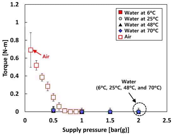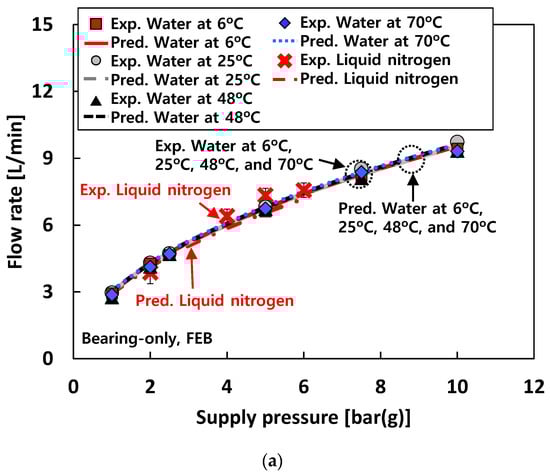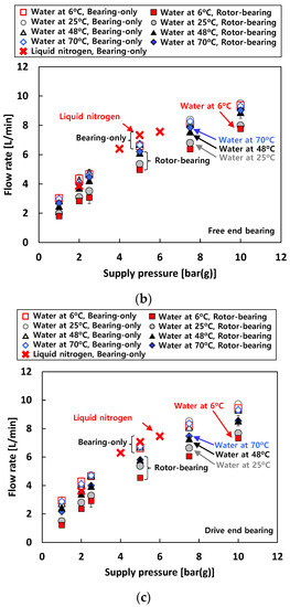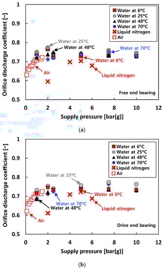 Figure 6 depicts the estimated orifice discharge coefficients (Cd) versus Ps. The orifice discharge coefficients are estimated using Equation (1) for water and liquid nitrogen and Equation (2a) for air. Note that the physical properties of air, water, and liquid nitrogen are taken from Refs. [22,23,24,25,26]. When air is used as a test fluid (i.e., test case #1), Cd gradually increases while Ps increases from 0.1 bar(g) to 1 bar(g), then shows an almost constant value of ~0.72 above 1 bar(g). When water is used as a test fluid (i.e., test case #2), Cd shows a nearly invariant value of ~0.74. In addition, for test case #2, the difference in Cd with increasing temperature of the test fluid is not notable. For test case #3, Cd ranges from 0.6 to 0.7. The differences in Cd for the free end bearing and the drive end bearing are not noticeable.