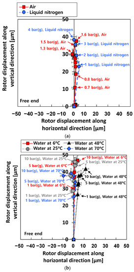 Figure 7 depicts the measured centerline travel (i.e., the static displacement of the rotor centerline) of the test rotor at the free end for increasing Ps. The initial position of the test rotor (i.e., the coordinates (0, 0) in Figure 7) denotes the rotor position within the test bearing when Ps = 0 bar(g). The centerline of the test rotor increases along the vertical plane as Ps increases. For test case #1 (i.e., tests with air), the test rotor is lifted off from the bottom of the bearing inner surface to ~25% of the (room temperature assembly) bearing diametrical clearance for Ps = 1 bar(g). For test case #3 (i.e., tests with liquid nitrogen), the test rotor is lifted off from the bottom of the bearing inner surface to ~23% of the (room temperature assembly) bearing diametrical clearance for Ps = 1 bar(g). For test case #2 (i.e., tests with water) with Ps = 1 bar(g), the test rotor is lifted off from the bottom of the bearing inner surface to ~31%, ~28%, ~26%, and ~25% of the (room temperature assembly) bearing diametrical clearance for at 6 °C water, 25 °C water, 48 °C water, and 70 °C water, respectively.