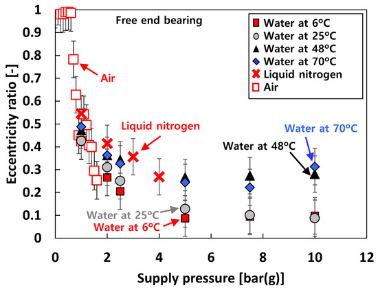 Figure 8 depicts the measured eccentricity ratio versus Ps for the free end bearing. The bearing eccentricity ratios rapidly decrease as Ps increases when Ps ranges from Ps = 0 bar(g) to Ps = ~5 bar(g), then becomes nearly invariant to Ps when Ps > 5 bar(g). For test case #2 (i.e., tests with water), at the same Ps, the eccentricity ratios decrease as the test fluid temperature increases. Note that the eccentricity ratios for test case #3 (i.e., tests with liquid nitrogen) are larger than test case #2 (i.e., tests with water).
