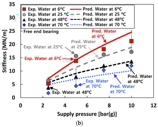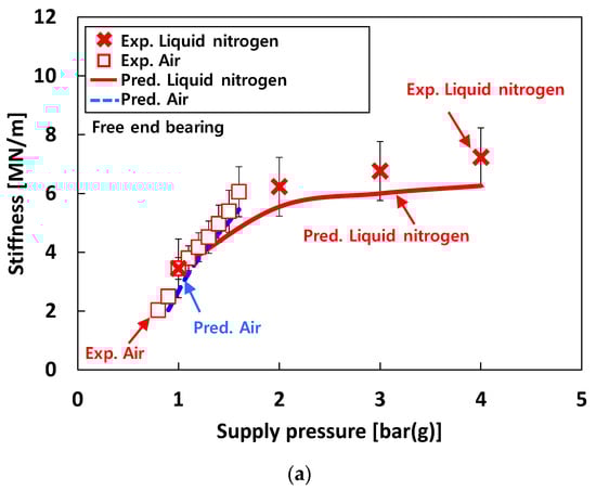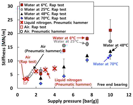 Figure 10 depicts the measured stiffnesses (K) of the test bearings from the rap tests (recall Figure 4b) for increasing Ps. The figure also includes the identified bearing stiffnesses from the excited frequencies due to pneumatic hammer instability for test cases #1 and #3. For test case #1 (i.e., tests with air), pneumatic hammer instability occurs when Ps > 1 bar(g). Therefore, when Ps < 1 bar(g), the natural frequencies are identified from the rap test, while those are identified from the frequencies excited by pneumatic hammer instability when Ps > 1 bar(g). The bearing stiffnesses for test case #2 (i.e., tests with water) are estimated by the rap test. For test case #3 (i.e., tests with liquid nitrogen), when Ps < 4 bar(g), it is important to note that due to insufficient thermal insulation around the test bearings in the bearing housing and low Ps for external pressurization into the bearings, the test fluid (i.e., liquid nitrogen) experiences a phase transition from all-liquid to two-phase (liquid–gas) flow in the thin bearing films. This two-phase fluid condition in cryogenic bearings for turbopump applications is not uncommon, see Refs. [27,28]. The test results clearly show significant effects of test fluids and bearing inlet fluid temperature (Ts) on the measured bearing stiffnesses.