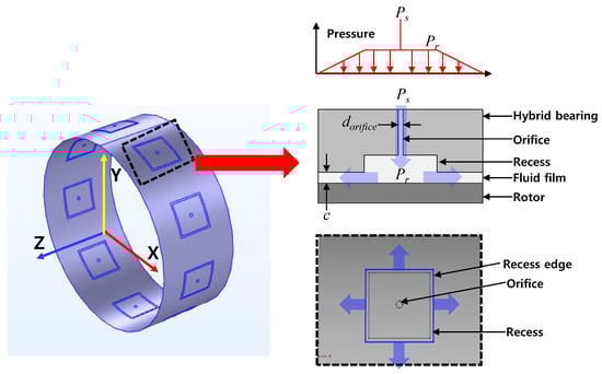 The boundary conditions of the hydrostatic bearing model are as follows. The film pressure of the edge of the bearing is the ambient pressure. The total inlet flow supplied through the orifice equals the total outlet flow exiting the recess. Flow continuity through the bearing recess using the flow equations defines the pressure in the recesses (Pr), recall Equations (1) and (2a–d). That is, Ps, Qr, and Cd mainly determine Pr. See Refs. [14,30] for further details on the fundamental model of multi-recess hydrostatic bearings which is employed in the present work.