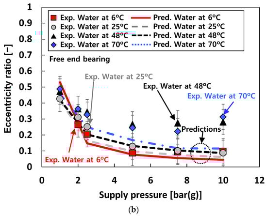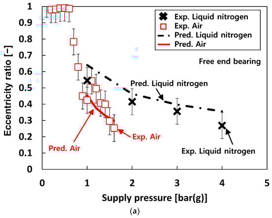 Figure 14 compares the predicted and the measured eccentricity ratios of the free end bearing for test cases #1 through #3. The predicted eccentricity ratios noticeably decrease with Ps. For test case #1 (i.e., tests with air), the predicted eccentricity ratios agree well with the test data. For test case #2 (i.e., tests with water), correlations between measurements and predictions become less favorable as the water temperature increases while those for 6 °C water are remarkable. For test case #3 (i.e., tests with liquid nitrogen), the predictions show a good agreement with the measurements even though the predicted eccentricity ratios are slightly larger than the test data.