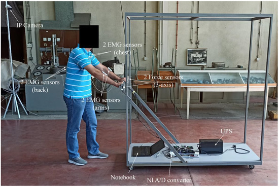 Studying the safety of repetitive physical tasks is of great importance as their non-ergonomic execution has been reported as a major cause of work-related musculoskeletal disorders. In this study, we presented a dedicated acquisition system with the purpose of assessing the safety of P&P of an industrial handcart. The system integrated two three-axis force sensors (placed on the left and right arm) and six EMG electrodes (placed on latissimus dorsi, pectoralis major, and flexor carpi ulnaris muscles). The study included a total of 20 male individuals without previous workplace injuries who were instructed to perform P&P over the complex path of ~30 m (ten repetitions). Detailed quantitative analysis was performed in two subgroups, Group 1 (without high psychological scores of stress, depression, anxiety, and apathy; without pain syndromes of the upper extremity; and without limited mobility of the thoracolumbar spine) and Group 2 (with high scores of stress, depression, anxiety, or apathy; with pain syndromes of the upper extremity; and with limited mobility of the thoracolumbar spine). The analysis of the acquired signal included the computation of ten force parameters (for both left and right side), one EMG parameter (for three different muscles, both left and right side), and three time-domain parameters. Out of all the parameters, the force parameter, integral values, and the EMG parameter, MAV of the left latissimus dorsi, were substantially different between the two groups. Specifically, the force parameter was approximately 100% and the EMG parameter was more than 400% higher in Group 2, suggesting that participants in Group 2 put significantly more effort into the same task. Moreover, the MAV of the left and right sides had similar values in Group 2, which was not the case for Group 1, implying different muscle activation patterns and that subjects in Group 2 conducted the task more symmetrically and carefully than those in Group 1. We can conclude that psychological factors and pain syndromes of the upper limb muscles have a significant impact on P&P safety and probably also on the risk of WMSD. Accordingly, future research on this topic will be directed towards considering more industrial workplaces and muscle groups, as well as incorporating computer vision algorithms for pose analysis (or alternative visual systems, such as [38]) and EEG sensor data for monitoring brain activities during working hours [39]. Additionally, innovative methods such as the use of brain–computer interface (BCI), EEG-based attention test with CPT and TOVA, and eye-tracking systems could be helpful to further examine attention levels [40,41,42,43]. To enhance safety, industrial workplaces of the future will rely on the integration of new industry 4.0 technologies: Safety 4.0 [44,45], Quality 4.0 [46], Logistics 4.0 [47], and collaborative robotics, especially from the perspective of ergonomics [48] and neuroergonomics [49].