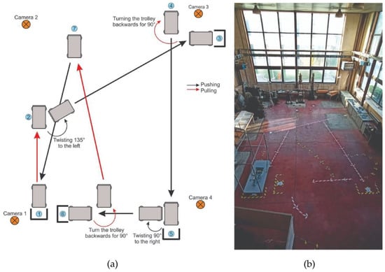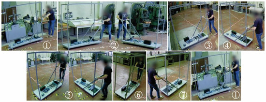The polygon was 9 × 6m in size (Figure 3). The floor was flat, similar to the industrial one, with occasional transitions from one type of base to another. This way of manipulating industrial carts (pushing, pulling, and turning) is a typical way of manipulation in industry. It contains all the elements necessary for conducting the experiment in terms of the direction of P&P, and the representation of the rotation of the cart in all directions, bearing in mind the most characteristic movements that occur in the industry.