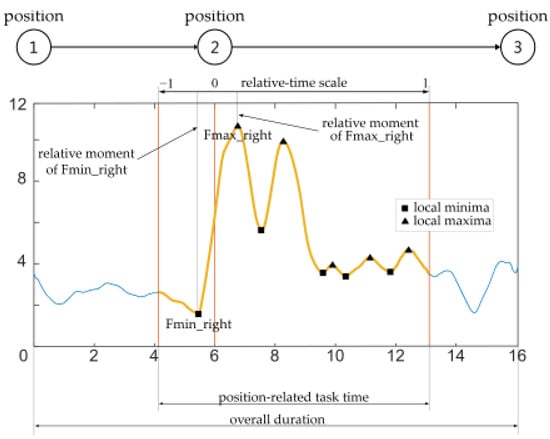 For the purpose of data interpretation and analysis, the experiment (Figure 3) was divided into six phases: from position ① to position ③ (P1-2-3); from position ② to position ④ (P2-3-4); from position ③ to position ⑤ (P3-4-5); from position ④ to position ⑥ (P4-5-6); from position ⑤ to position ⑦ (P5-6-7); and from position ⑥ to position ① (P6-7-1). Furthermore, to be able to relate the physical action with the actual position more precisely (e.g., P2), all phases were further divided as follows: the last 30% of the time needed to reach the middle position from the beginning position (e.g., P1-2), and the first 70% of the time from the middle position to the end position (e.g., P2-3), as depicted in Figure 5. All force and EMG parameters were calculated on the aforementioned six sub-segments. Parameters for relative moments of the events of sub-segments were in the range from −1 (30% left of the middle point, e.g., P1) to 1 (70% right of the middle point, e.g., P3). The middle point had a value of 0 (e.g., P2). The force parameters considered for both left and right sensors were: mean value, standard deviation, maximal value, minimal value, the integral value (area under force curve), overall duration, the relative moment of the middle position, the relative moment of the maximal value, the relative moment of minimal value, the maximal difference of consecutive extremums, number of local maxima, number of local minima, and position-related task time. The normalized EMG parameter considered for each muscle was mean absolute value (MAV).