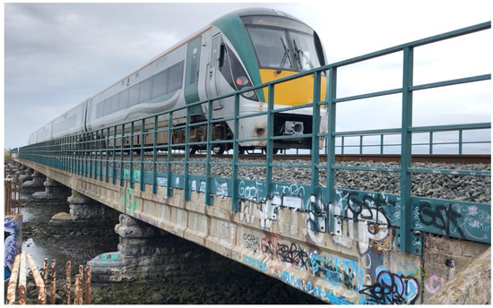 The Malahide Viaduct is a 12-span bridge, constructed in 1844 over the Broadmeadow Estuary, Dublin, Ireland (Figure 1). It contains a double railway track that serves the Dublin–Belfast railway line and freight trains. In 2009, two of its spans (Spans 4 and 5, as shown in Figure 2) and Pier 4 collapsed due to scour caused by a flash flooding event [51]. After the event, the viaduct has been rehabilitated and monitored to avoid the risk of soil erosion and damages caused by increased loading conditions from the passing trains [7]. The collapsed spans and pier were replaced with stiffer spans and new pier foundations were installed with micropiles [53,54] (see Figure 1b with box showing the replaced spans and pier). The total length of the viaduct is almost 175 m, and the width is approximately 9.0 m. The first two spans at both ends (Spans 1, 2, 11 and 12) are 12.2 m long, and are shorter than the remaining, inner spans (Spans 3–10), which are 15.85 m long. The spans are made from precast concrete beams with an in situ deck, and the original piers from cut stone masonry. Pier 4 (replaced after the collapse in 2009) is made from in situ reinforced concrete with a precast bearing shelf [7]. The entire viaduct bridge when a train is passing over it, is shown in Figure 2.