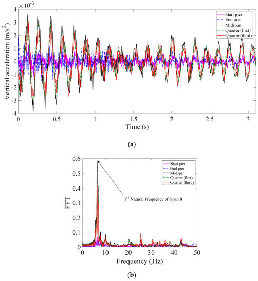 Forced-vibration response of Span 8: (a) in time domain, and (b) in frequency domain.