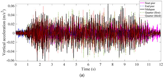 The first natural frequency of each span of the Viaduct was calculated using a Fast Fourier Transformation (FFT) of the free and forced vibration data. For each span, the forced and free vibrations after three passing trains were used to estimate the first natural frequency. An example of the vibration signals measured at five locations of span 8 (one of the existing/old spans with longer length) and their FFTs following a train crossing, are shown in Figure 4 and Figure 5 for free and forced vibrations, respectively. In this example, the bridge is excited by a passing freight train (consisting of 11 carriages) on a Dublin to Belfast route. From comparing the forced and free vibration signals, it can be seen that the later shows more frequencies (containing both the vehicle and the bridge frequencies) in a range higher than the bridge fundamental frequency. The first peak in the frequency domain, as shown in Figure 4b, corresponds to the first natural frequency of the bridge, which was evident in the data from all five sensors at Span 8. Similarly, the bridge frequencies are also estimated from the forced measurements. The first natural frequency of each span (averaged from free and forced vibrations caused by three passing trains) is summarized in Table 1. From this table, it can be seen that (1) the shorter spans have higher first natural frequency, as expected, (2) the first natural frequencies of the replaced spans (Span 4 and 5) are higher than the other spans of equal length (Span 3 and Spans 6–10), (3) the frequencies estimated from the forced vibrations are lower than the frequencies from the free vibrations, which may be a result of an added mass of the passing train. This confirms that the replaced spans are different than the other ones, due to their higher stiffness to mass ratio.