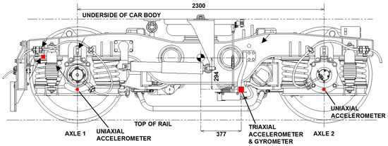 Layout of the sensors on an instrumented bogie of the train (dimensions in mm) taken from [55].
