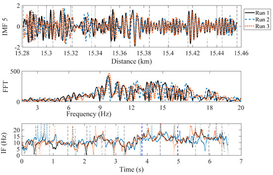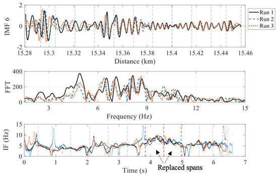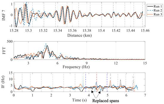 IMFs 5, 6 and 7 along with their FFTs and IFs are illustrated in Figure 9, Figure 10 and Figure 11, respectively. For checking the repeatability of the analysis, results from three runs are plotted in these figures. The FFTs and IFs of IMF 5 in Figure 9 show frequency components in this signal that lies in a range of 10–17 Hz, which are higher than the range predicted for the first natural frequencies of the spans. The FFTs of IMFs 6 (Figure 10) show that there are multiple frequencies in the range of 5–9 Hz, which are mixed together because of their proximity. The IF 6, on the other hand, shows that the frequencies change with time, especially in between 3.8 s and 5 s, where a modest increase in frequency is evident. This is the region where two spans and a pier have been replaced with stiffer components, which may explain the increase in the IF frequencies. This result may be used to estimate the bridge natural frequencies, or at least a pattern of changing bridge frequencies between spans. Although there may be a contribution from different train masses and velocities [56], the overall pattern of the frequencies may indicate changes in the span frequencies. The FFTs of the IMFs 7 (Figure 11) illustrate lower frequencies (lower than 5 Hz), that are not close to the bridge natural frequencies and therefore are not considered in this study.