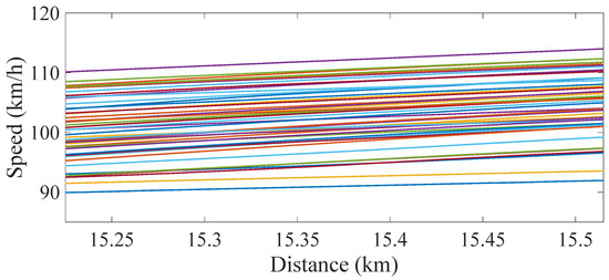 In this paper, EEMD-based HHT is used to identify the IFs from indirect acceleration measurements. As seen in Section 3, the first natural frequencies of the replaced bridge spans are higher than the frequencies of the original longer spans. In this section, IMF 6 is chosen to be used for estimating the pattern of changing frequencies in a multiple span bridge. Since the frequencies must be consistent for each span, an average of IFs for each individual span is considered. The train bogie accelerations from 41 train runs are used in this study to verify the efficacy of the proposed approach. The speed of each train changes as it traverses the bridge (mostly seen to increase in magnitude; see Figure 12) [7]. The details of the velocity effect on the train bogie accelerations are presented in [7].