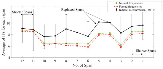 Figure 13 shows the average of each span’s IFs (calculated using the IMF 6 measurement) estimated from the indirect measurements. The first natural frequencies measured directly from the free and the forced vibration measurements (Section 3) are also shown (dotted and dashed lines, respectively) for comparison. For the indirect measurements, as the results are collected from multiple runs, error bars are plotted using a mean and (+/−) two standard deviations (representing more than 95% of the total results). It can be seen in Figure 13 that the average of the IFs for each span approximately follows the pattern from the direct measurements of the first natural frequencies, especially where the replaced spans are located (Spans 4 and 5). In addition, the natural frequencies estimated from the indirect measurements are closer to the frequencies estimated from the forced vibrations. This is an important finding showing the shift in the estimated frequencies due to the presence of the train. This change in frequencies is due to the fact that the added mass effect of the train is present in both cases of drive-by and forced vibration, which resulted in a frequency shift compared to the free vibration scenario. In addition, for the spans which are equal in length, the consistency in frequencies around the unreplaced spans is well detected by the drive-by approach and follows the same pattern as the direct measurements. However, the results for the shorter spans are not accurate which may be caused by several reasons, e.g., mode mixing or the edge effects that exist in the HHT process. In order to evaluate the impact of mode mixing, the averaged IFs are re-calculated using IMF5 and are compared to the direct frequencies in Figure 14. This figure shows that the frequencies estimated using IMF5 are highly spread around the mean value for all the spans (compared to Figure 13), which means the results are less reliable compared to IMF6. However, the IFs from IMF5 estimate the fundamental frequencies of spans 11 and 12 with reasonable accuracy, while the results for spans 1 and 2 are still not acceptable. It can be concluded that a single IMF calculated from the proposed approach in this study can be used for estimating the fundamental frequencies of the spans with similar lengths when the spans with different stiffness values can be clearly detected. However, when the span lengths are different, the problem becomes more challenging and in some cases, a different IMF can reveal the fundamental frequencies of those spans. In addition, it can be concluded from Figure 6 that some of the IFs estimated using HHT includes edge effects at the beginning and end of the signals which could result in inaccuracy in the process of frequency estimation as observed in Figure 13 and Figure 14.