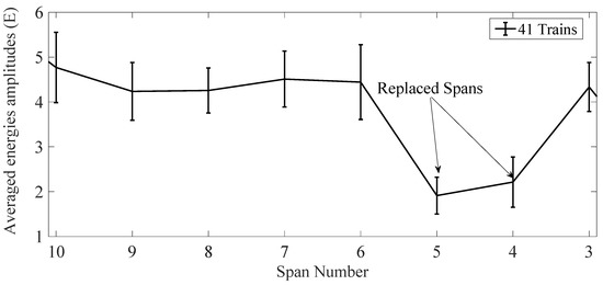 As reported in [7], the amplitude of the train acceleration signals for the replaced spans changes for the stiffer spans and the natural frequency, suggesting that the energy of frequencies for these responses will be lower for the replaced spans relative to the energies for the original spans. In this section, the amplitudes of the energy are assessed for each span. The purpose of this section is to determine how the energies of all the frequencies are affected and can be used for damage detection without having any prior knowledge of the spans’ natural frequencies. For that purpose, a sum of all the energies is considered. Each HT spectrum contains IF, energy amplitudes and phase angles for each IMF. An average of all the energies from each span is calculated for each IMF, which are then added together to determine the change of energies (in all the IMFs combined). Figure 15 shows the sum of averaged energies from each IMF for each span using the 41 trains runs with error-bars (mean +/− two standard deviations). As concluded in Section 4.3, for a multiple span bridge, it is better to employ the EEMD only for the spans of equal length. Therefore, only Spans 3–10 are used in this section. It can be seen in the figure that the averaged energy of the frequencies, combined from all the IMFs for each span, is less for the replaced spans. This indicates that the change in the span stiffness, not only changes the fundamental frequency of those spans, but also reduces the energy of the frequencies extracted from drive-by measurements using the signal processing tools (EEMD-based HHT). In this particular example, the higher stiffness to mass ratio of the replaced spans (negative damage) has resulted in a significant decrease in the energy amplitude of the IMFs. This is an important finding which can be used for developing novel damage indicators using drive-by approaches which can define global stiffness changes in multi span bridges.