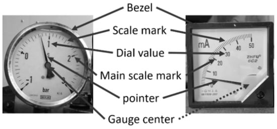 Industrial automation is an unstoppable trend because of its profitable benefits in industrial evolution. However, many old analog gauges still exist in different sectors. Those who engage in manual gauge reading must spend time travelling to the gauges to read them and write down their current values. It is a time-consuming, expensive, and error-prone process. Thus, automatic gauge reading has become a very important research topic. It uses a camera to capture images of the analog gauge to cost-effectively read out the gauge values via computer vision techniques. Although analog gauges may have different shapes of their bezels, there are usually two categories of gauges in their charts: circular and arc. As shown in Figure 1, they have five visible characteristics: a bezel, scale mark, pointer, dial value, and gauge center.
