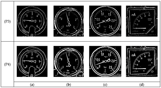 In SGR, the color gauge image is first converted into a grayscale image (as Figure 2). Then, the adaptive threshold is used to binarize the image (as Figure 5 (P1)). Since scale marks, dial values, and pointers are black on the gauge, these objects have inverted image color with respect to the main objects in the CC (as Figure 5 (P2)). Erosion (as Figure 5 (P3)) and dilation (as Figure 5 (P4)) are then employed to remove noise.