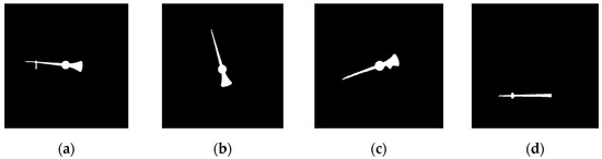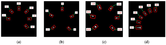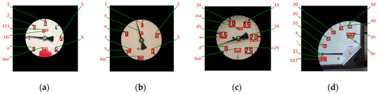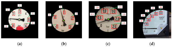 When Keras-OCR encounters negative dial values, the minus sign cannot be recognized correctly. Figure 11b shows that the ‘−1’ dial value detected by Keras-OCR becomes a ‘1’ whose minus sign is lost. In order to overcome this problem, the proposed algorithm uses the ‘0’ obtained by Keras-OCR to further inference the negative numbers. The members of are sorted in a clockwise order according to their angles. For members of located before element ‘0’, they can be judged as negative and a minus sign can be applied to them.