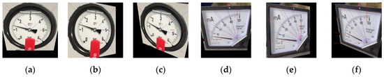 Results of image perspective distortion. (a) X-axis rotated 30 degrees on circular gauge. (b) Y-axis rotated 30 degrees on circular gauge. (c) X-axis rotated 30 degrees and Y-axis rotated −30 degrees on circular gauge. (d) X-axis rotated 30 degrees on arc gauge. (e) Y-axis rotated 30 degrees on arc gauge. (f) X-axis rotated 30 degrees and Y-axis rotated −30 degrees on arc gauge.