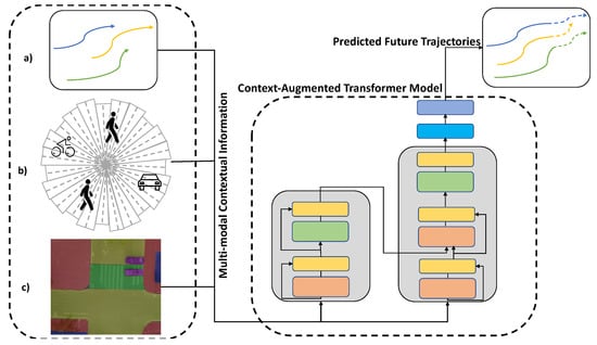 Our proposed context-augmented transformer framework for pedestrians’ trajectory prediction. The input is a multimodal contextual information: (a) past observed positional information, (b) agent interactions information and (c) scene semantics information. The output from our framework is the future positional information of all pedestrians in the scene.