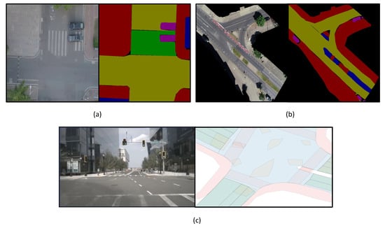 Sample images of an urban traffic shared space with its corresponding semantic label map from (a) DUT dataset [29], (b) inD dataset [30] and (c) nuScenes dataset [31].
