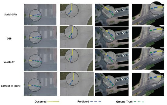 As it can be shown from Table 3, our proposed context-augmented transformer model ‘Context-TF’ has outperformed all the baseline models in terms of ADE/RMSE scores over both the DUT and the inD datasets. These scores further prove our claims that having more contextual information to the transformer model helped in boosting the overall performance of the model. Furthermore, in Table 3, we also report the performance of our proposed model with all the baseline models over short-term prediction horizons, namely 1, 2, 3 and 4 s ahead. Our context-augmented transformer model continued to provide robust results among the short-term prediction horizons; the only exception was in the DUT dataset, where the OSP and Vanilla-TF achieved lower ADE/RMSE scores over shorter time prediction horizons (1 and 2 s). We believe the reason for that, is that at such shorter time prediction horizons, there is not enough contextual information that could be discriminative enough to help in providing more accurate predictions. Moreover, the trajectories in the DUT dataset took place on a university campus where pedestrians might not be following the common-sense rules in urban traffic environments (such as pedestrians would generally prefer to walk on the side-walk). Additionally, another reason for that is the fact that OSP relies on a Kalman filter for giving predictions, which is well known for its competitive reasonable results in the shorter time prediction horizons [11,22]. On the contrary, the Social-GAN and MATF models have failed in giving competitive scores in comparison to our proposed model and the other baseline models. The reason for that is due to the fact that the number of interactions between pedestrians and each other in urban shared traffic spaces is not in line with the same quantity and density of the interactions that appear in crowded spaces.