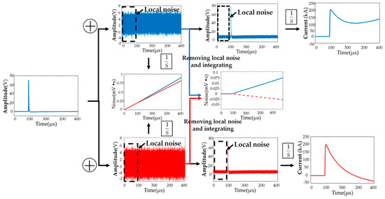 As shown in Figure 7, the clear signals are superimposed with different noises. After the signal without local noise is integrated, updrift (blue line) and droop (red line) effects appear. This waveform distortion leads to a failure to identify the half-peak time. The droop effect usually causes designers to think that the bandwidth is insufficient, but this droop effect is caused by numerical integral drift. In Figure 7, after removing the same local mean of the noise signal and integrating it, it can be seen that the global mean of the up noise (blue line) is larger than the local mean, whereas the global mean of the down noise (red line) is smaller than the local mean. As can be seen in Figure 7, this slight difference will also lead to a severe distortion of the waveform after integration. The reason why the wavefront time distortion is smaller than the half-peak time is that the error of this numerical integration is cumulative.