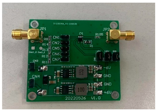 In this study, a surface current sensor is designed to verify the proposed method. The diameter of the enameled wire is 0.1 mm, and the radius of the winding post is 17 mm. Assuming the lower measuring limit of the magnetic field is 1 A/m, then Equation (17) should meet . The output voltage of the single-turn coil is thus 0.685 mV. According to Equation (17), the number of coil turns is determined to be 10. The value of RL ranges from 696.3 Ω to 2.8 kΩ (take RL = 2.4 kΩ). The OPA659 chip, with a high bandwidth, unity gain stability, low drift, and low noise performance, is used to construct the voltage follower.
