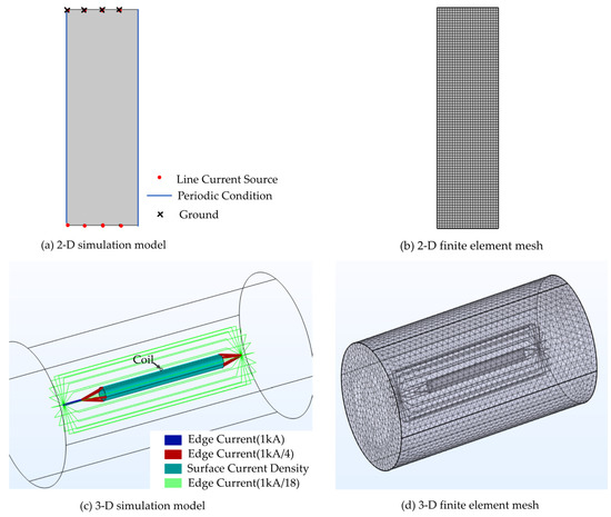 Numerical model of calibration system including excitation settings for 2-D model (a), and 3-D model (c), mesh setup for 2-D model (b), and 3-D model (d).