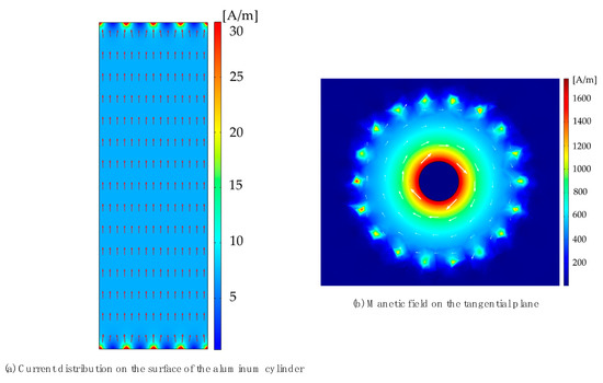 The surface current (2-D model) and magnetic field on the tangential plane of the aluminum barrel (3-D model).