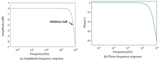 For the bandwidth of the sensor, the amplitude-frequency response curve of the sensor can be obtained according to the measured values of the stray parameters of the coil, as shown in Figure 13. The −3 dB cut-off frequency is at 50 MHz, which is much higher than the frequency band of the lightning current waveform. This demonstrates that the B-dot sensor designed in this study could totally cover the lightning frequency. The frequency band of the voltage follower constructed by OPA659 can reach 650 MHz at unity gain, which is not the main factor limiting the frequency band of the sensor.