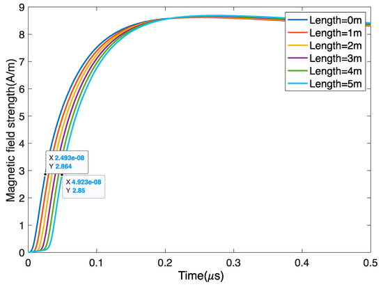 We discover that the spurious parameter of the RG58 coaxial line is 100 pF/m, and then use the 10-level LC link to be equivalent. Next, the output signal is numerically integrated by using the trapezoidal method. The length of the coaxial line changes from 0 m to 5 m, and the output waveform after integration is shown in Figure 14. For the RG58 coaxial cable, due to the delay in the transmission line, the rising edge of the waveform is delayed by approximately 5 ns for each additional 1 m, and the amplitude decreases by 0.016 A/m after integration. Therefore, part of the measurement error can be eliminated by multiplying by a factor or by using a coaxial cable of the same length.