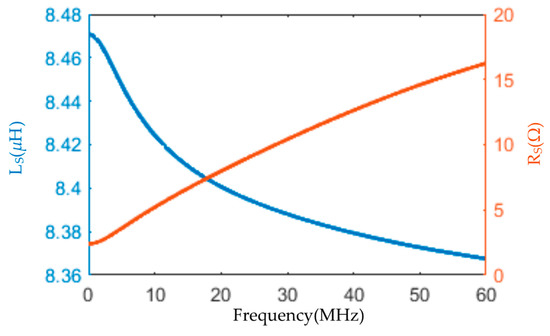 To analyze the influence of the skin effect on the internal resistance of the coil, the curves of the coil resistance and inductance are obtained by using the frequency sweep function, as shown in Figure 15.
